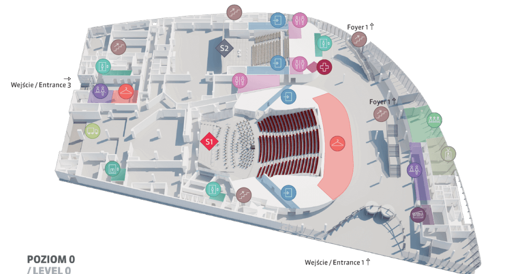 Wejście do niego znajduje się w Foyer na poziomie 0, przy windach osobowych.